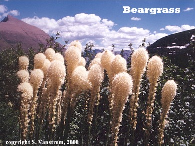 The ICEBERG LAKE TRAIL is a popular destination in the Many Glacier area of the park. The trail begins steeply, then ascends gently past Ptarmigan Falls (very cold, it's a great place to cool your tired feet on the return), and reaches the lake after 7 miles. The lake is one of those beautiful turquoise lakes so familiar in the park. From the vantage point at the end of the trail, you'd think it's mostly open water. From a higher view, you would see it's mostly ice, hence the name. It's surrounded on many sides by high mountain walls, a setting known as a cirque. Watch for beargrass along the trail. Actually a member of the lily family, beargrass can be a spectacular sight, though some years are better than others. Speaking of bears, the Iceberg Lake trail is frequently visited by grizzly bears. |